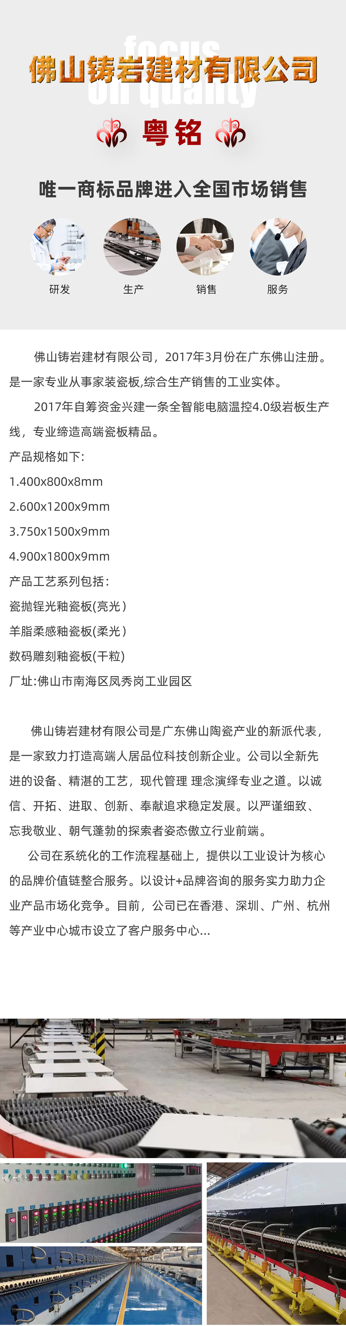 粵銘瓷板屬于一線品牌,是佛山陶瓷市場的陶瓷一線品牌之一,具有歷史悠久和不斷創新的特點。是一家致力于打造品味高端人居的瓷磚品牌,公司以精湛工藝,先進設備,現代理念演繹專業之道;以誠信、開拓、進取、創新、奉獻追求穩定發展;以嚴謹細致、忘我敬業、朝氣蓬勃的探索者姿態傲立行業前端。公司在系統化的工作流程基礎上,提供以工業設計為核心的品牌價值鏈整合服務,一站式服務內容包括:產品設計研究、產品差異化定位、工業設計、結構設計、商業命名、品牌設計、后續模具支持、品牌及產品知識產權保護等,以設計+品牌咨詢的服務實力助力企業產品市場化競爭。目前,公司已在香港、深圳、廣州、杭州等產業中心城市設立了客戶服務中心,服務...